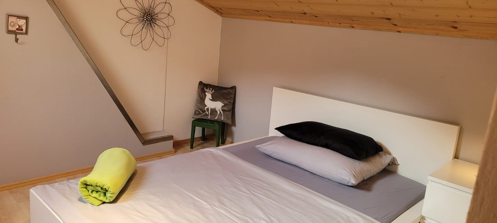 Das Schlafzimmer befindet sich auf der Galerie und verfügt über ein gemütliches Doppelbett. Zweites Schlafzimmer gut geeignet für 1 Erwachsenen oder 2 Kinder.